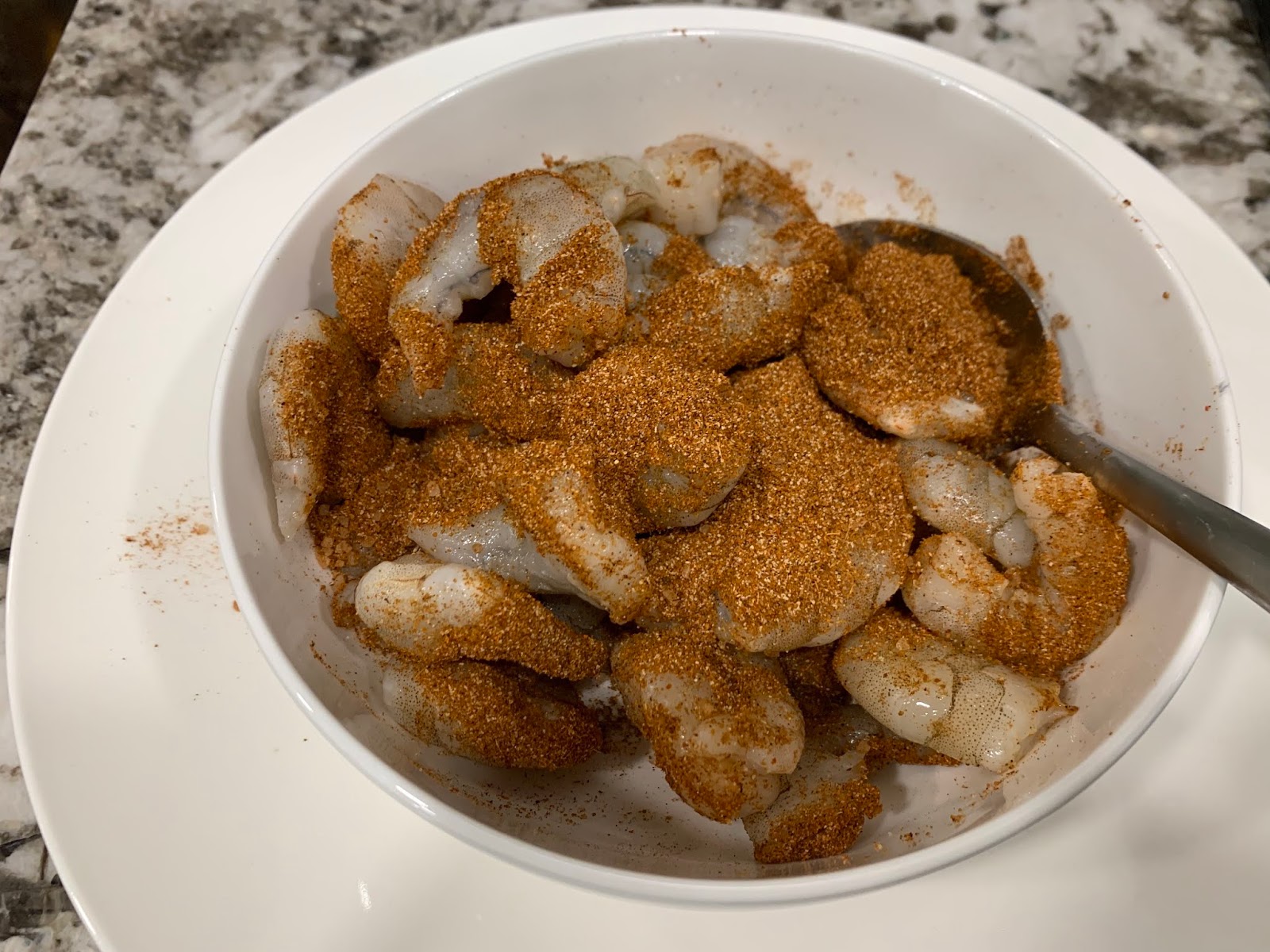 Pat the shrimp dry with paper towels. Toss the shrimp in a small bowl with the spice mix to get it coated. Heat about a tablespoon or less of oil a large skillet over medium high heat.