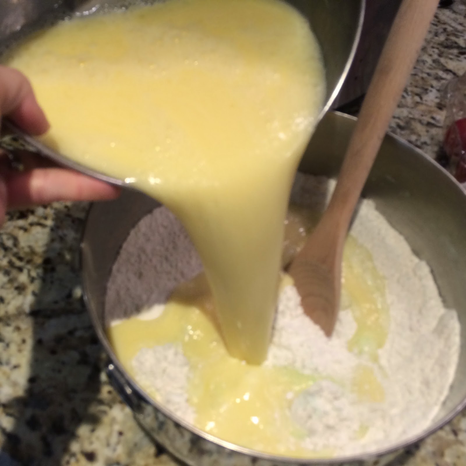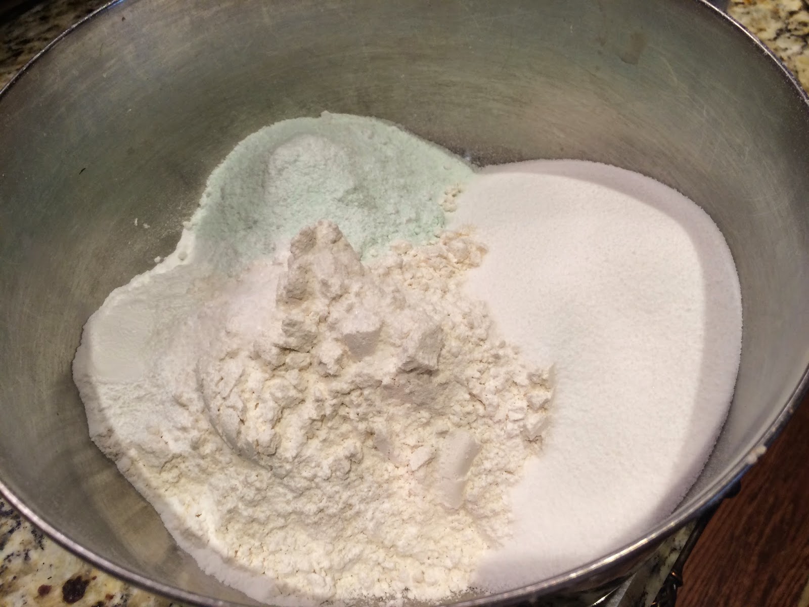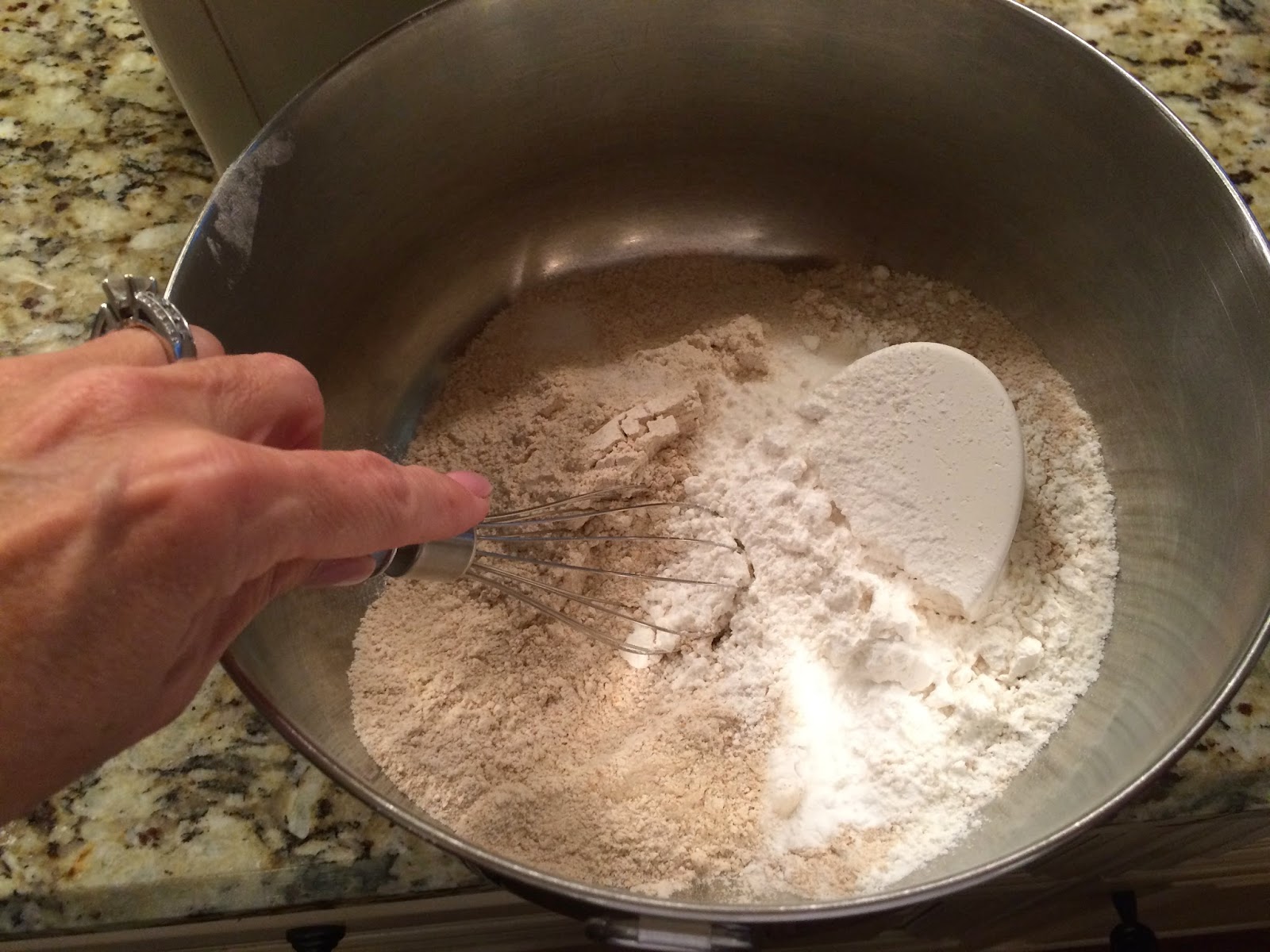 In a large bowl, whisk both flours with the baking soda and salt.