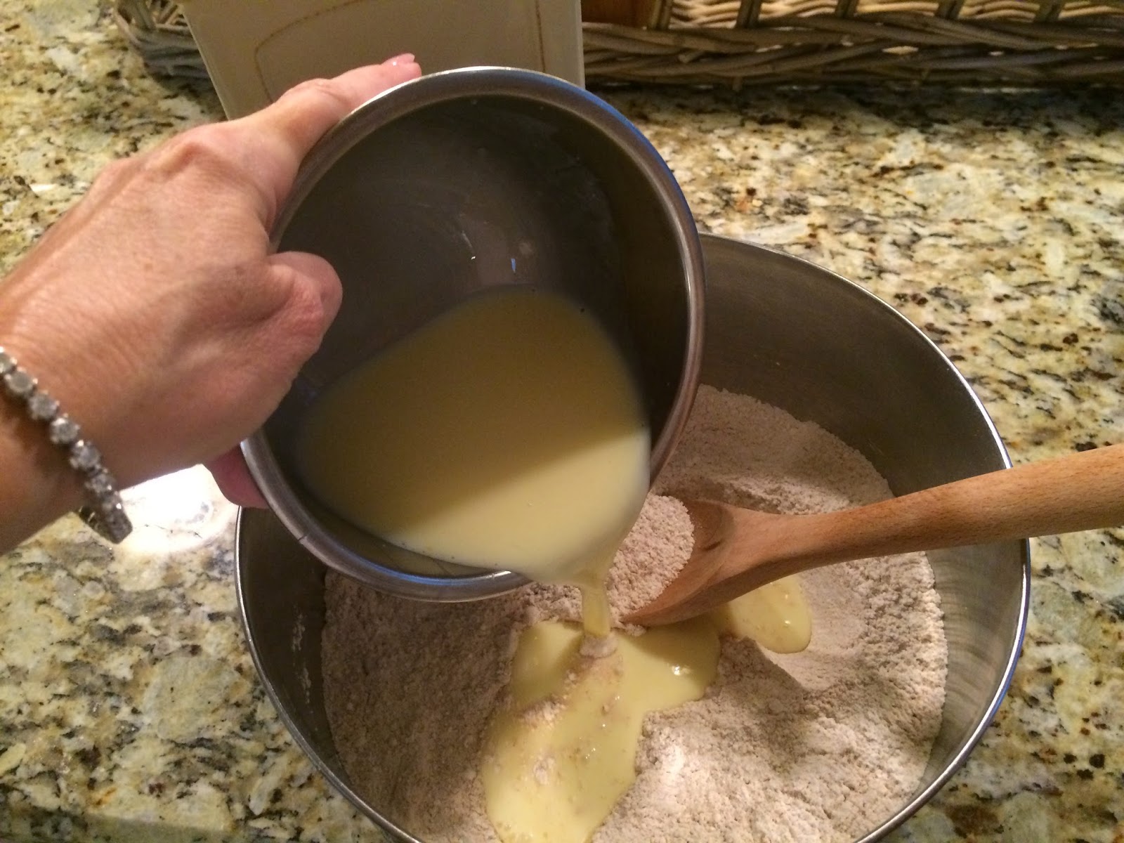 Mix the flours, baking soda, salt and rolled oats in a bowl.