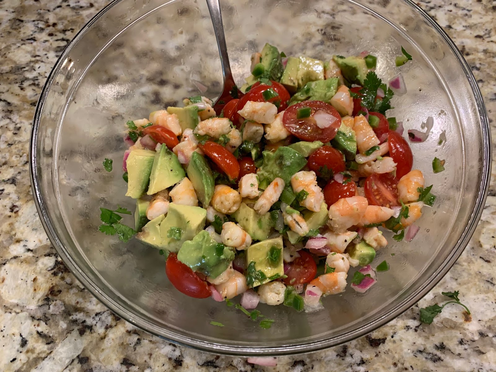 This shrimp salad is so fantastic! The combination of flavors with the tangy lime, sweet cilantro and zesty red onion and jalapeño with the shrimp and avocado is amazing. We always try and buy some shrimp when we’re in Florida, so we can freeze it by the pound and enjoy fresh delicious shrimp anytime we want.