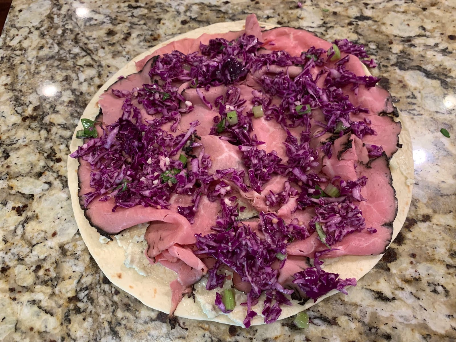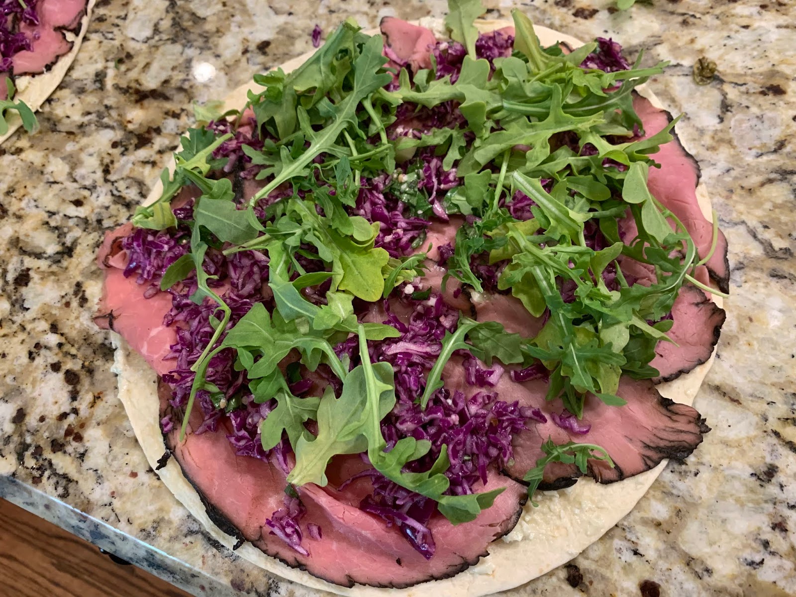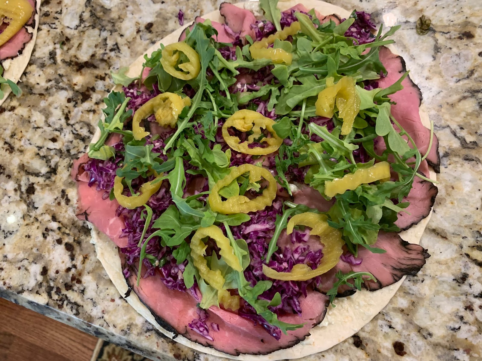Divide beef and cabbage mixture evenly among tortillas. Toss in some arugula, and sprinkle on some banana peppers.