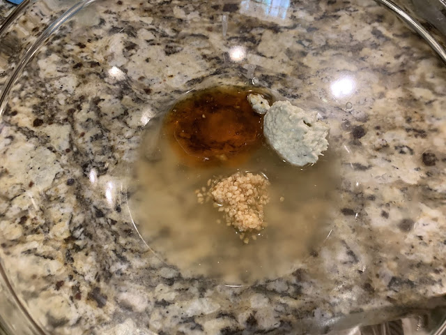 Combine 1 tablespoon cheese mixture, vinegar, honey, and garlic in a medium bowl.