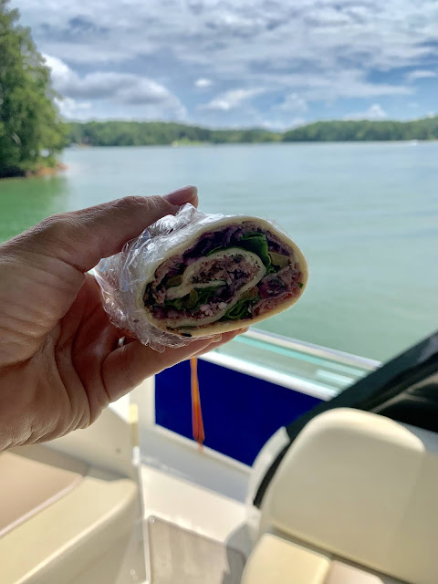 This recipe is another one that’s perfect for boating. You make the wraps early in the day, roll them in plastic wrap and chill, and when you’re hungry, just grab them and go. They’re delicious! Serve with your favorite crunchy chips and some fruit and you’re set! They are heavy on the blue cheese, so if you’re not a fan, substitute with feta if you like.
