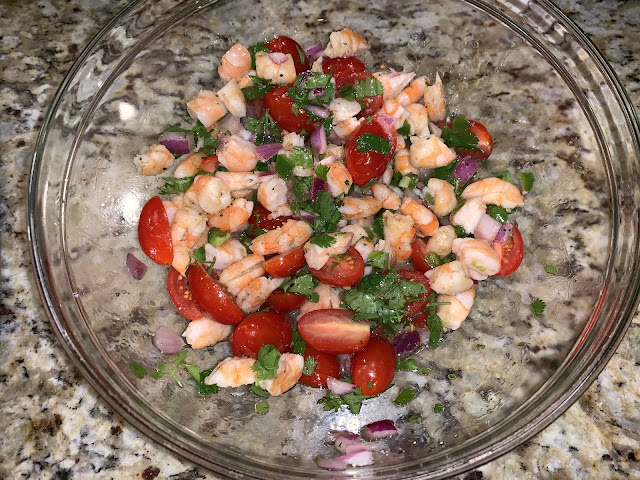In a large bowl combine chopped shrimp, tomato, jalapeño and cilantro. Add the onion/lime mixture and stir.