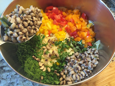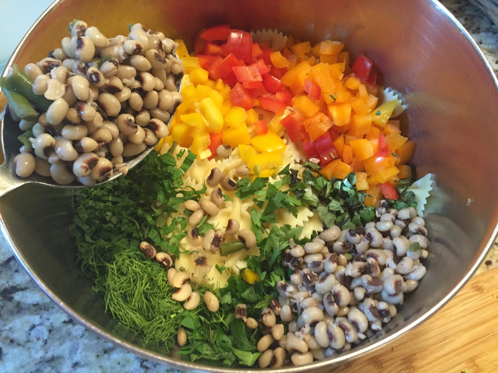 Toss together field peas, pasta, bell peppers, parsley, basil, dill, mint, and, if desired, chicken.
