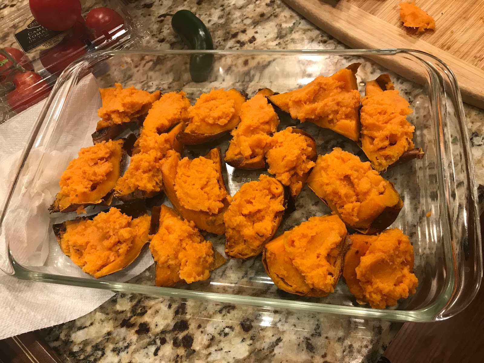 Halve sweet potatoes lengthwise; scoop out 1/3 cup flesh from each half into a medium bowl. Then cut the potato skins in half or into thirds (depending on the size of your potato).