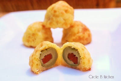Mix all of the ingredients together (except the olives). Dry the olives as best you can and mold a rounded teaspoon of the dough around each olive. Bake on a cookie sheet at 400 degrees for 12-13 min. Serve warm