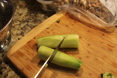 Peel cucumbers, then cut in half lengthwise and take a small spoon and scrape out seeds. Discard seeds. (If you use the small seedless or European cucumbers with few seeds, you can skip this step.) Slice cucumbers, then put in a colander, sprinkle on 1 T salt, and let stand for 30 minutes to draw out water. Drain well and wipe dry with paper towel.