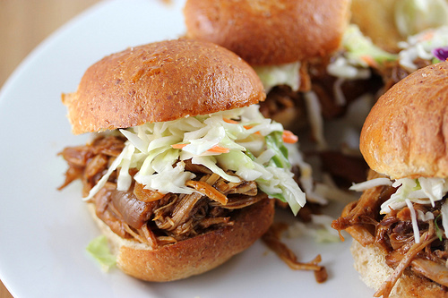 Spoon pulled pork onto the bottom half of a slider bun, spoon on coleslaw with a slotted spoon, and place on the top half of the bun.