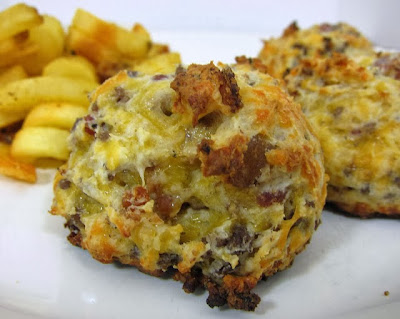 In a bowl, combine biscuit mix, bacon and cheese; stir in cooked beef.