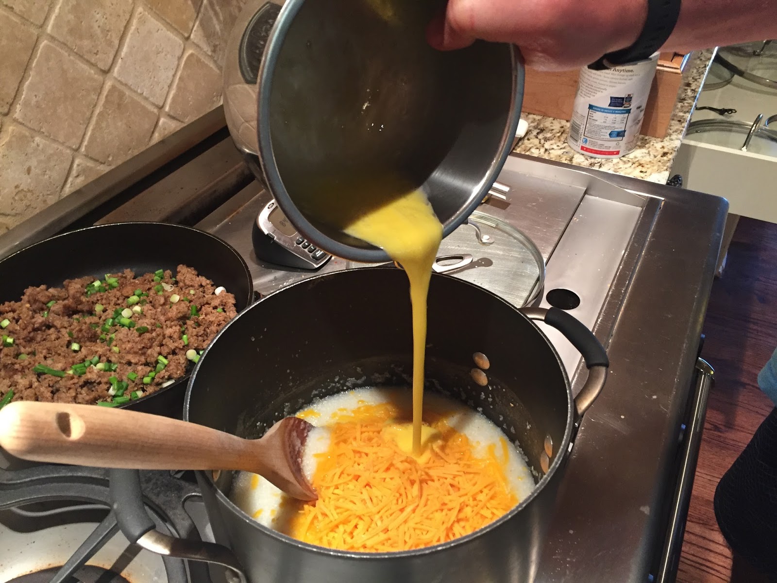 Add butter, egg, and 1 cup of the cheese to grits. Combine grits mixture with sausage mixture.