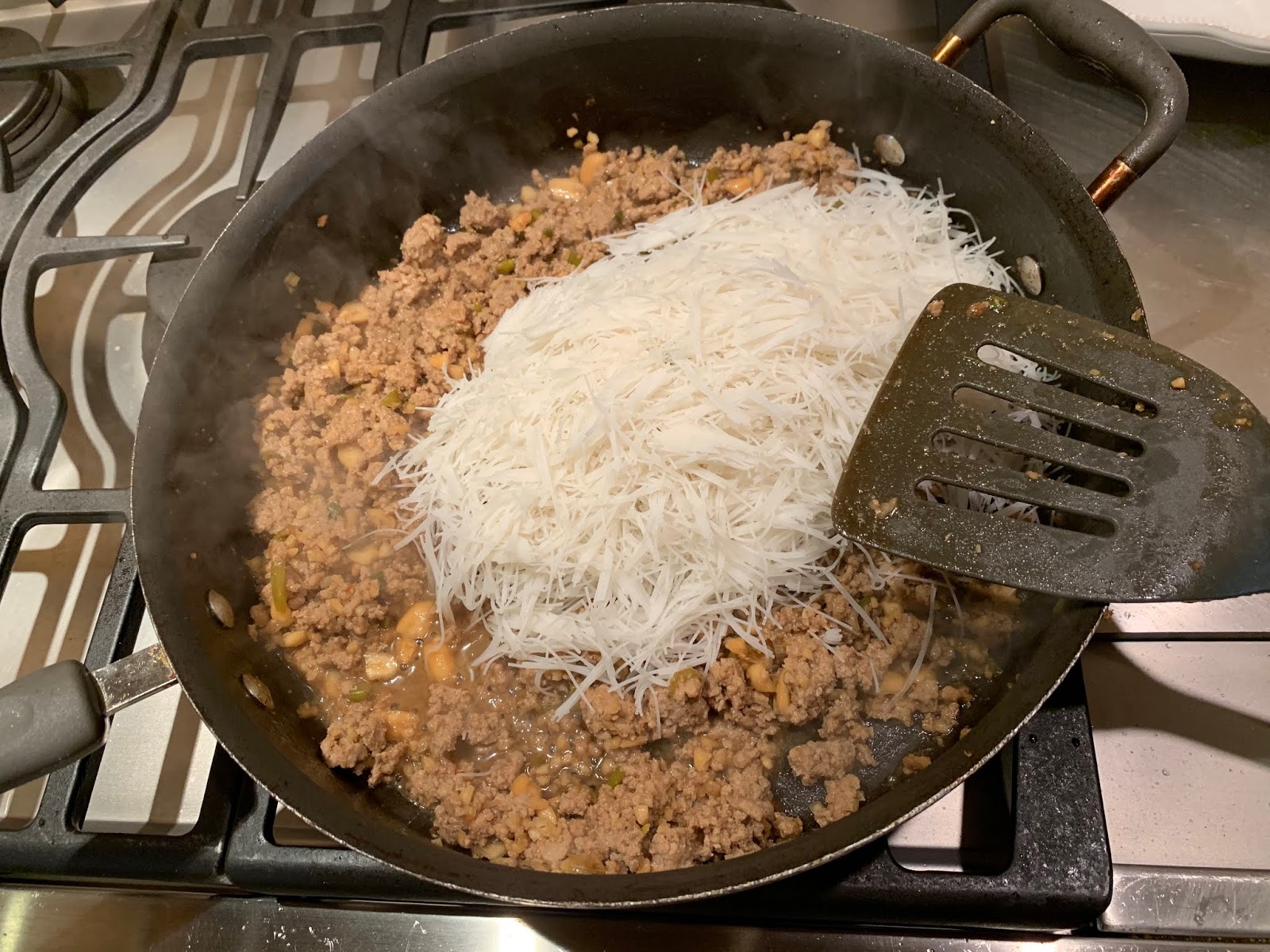 Add the meat and peanut mixture, and sauté for 10 minutes or until completely cooked through.