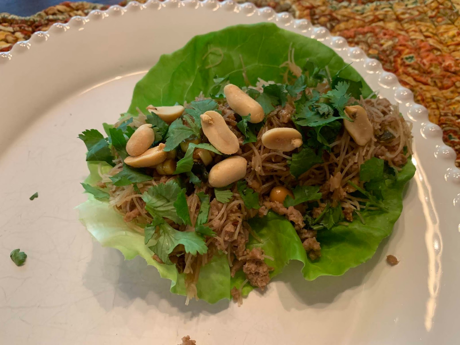 Remove from heat, scoop mixture into lettuce leaves, top with cilantro, green onions, peanuts, and the reserved sauce.