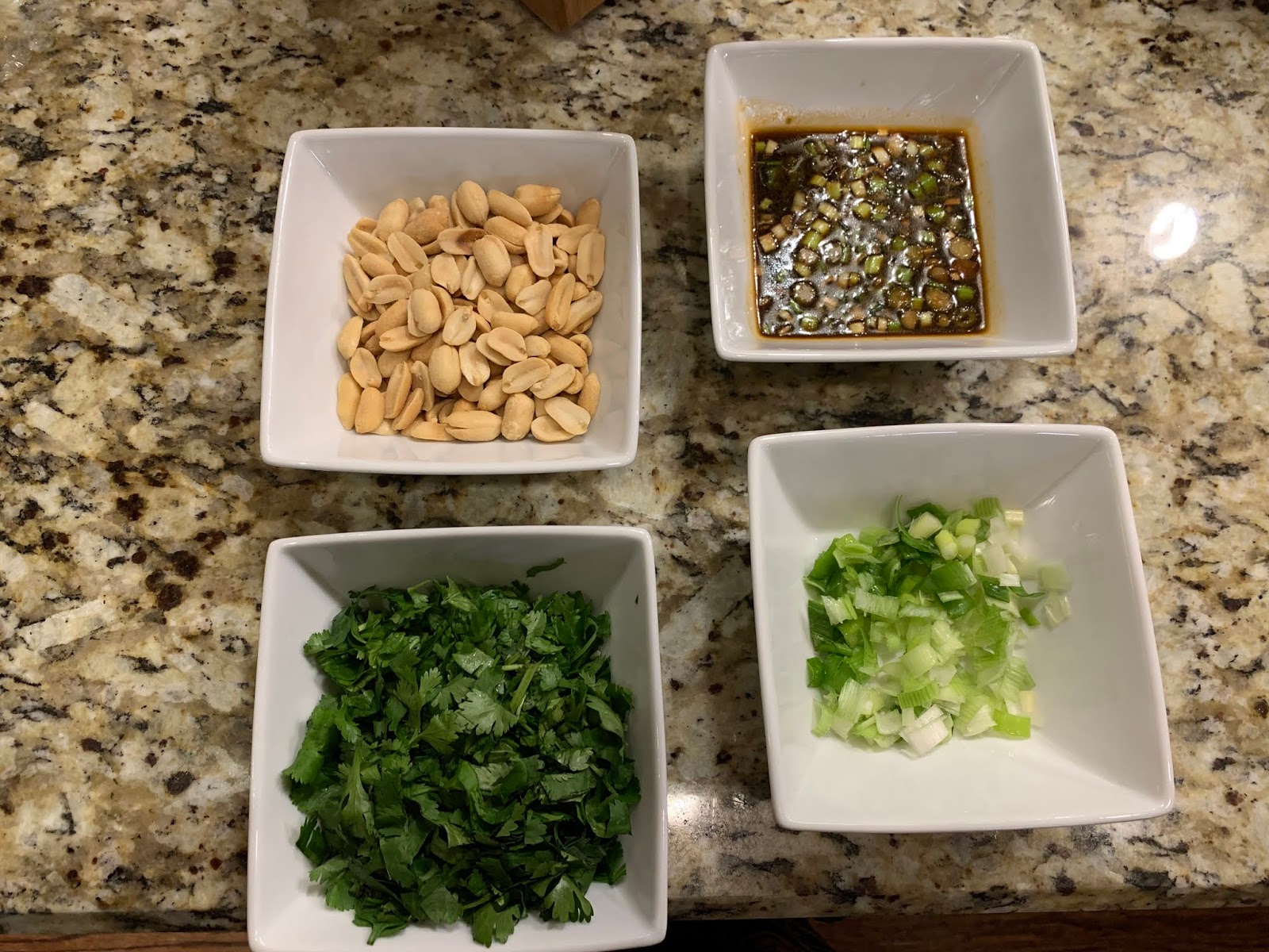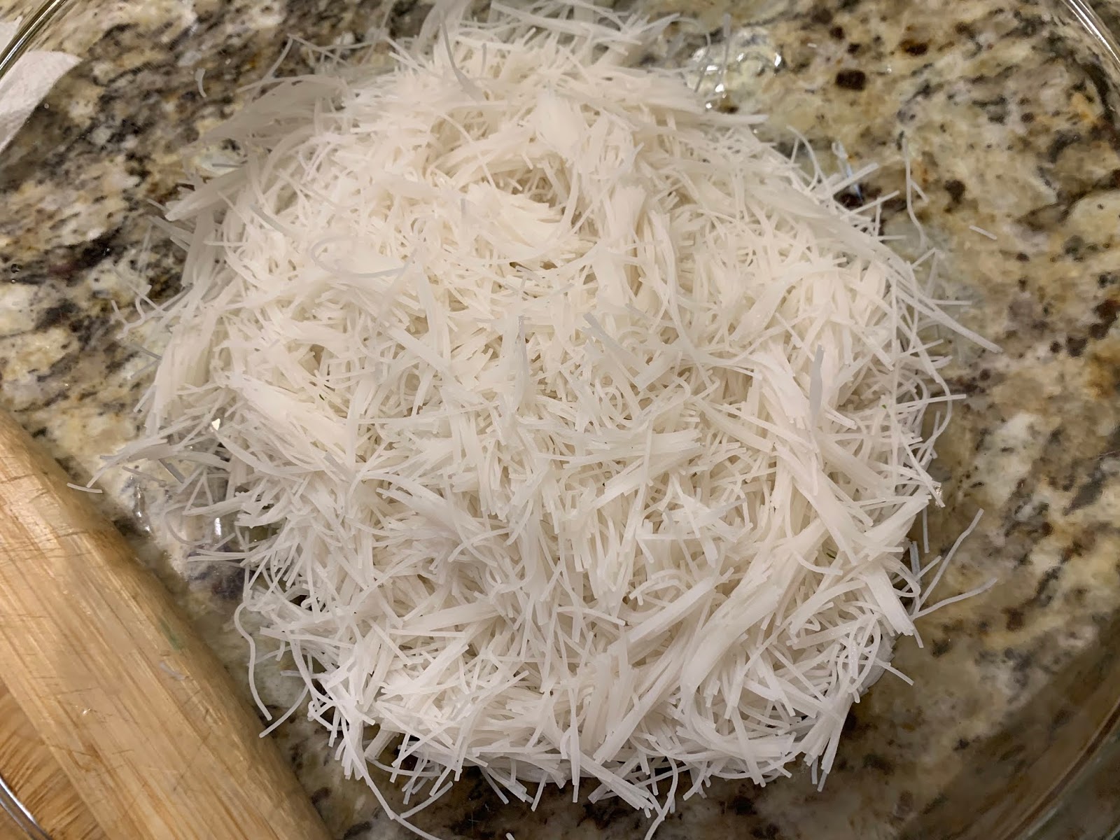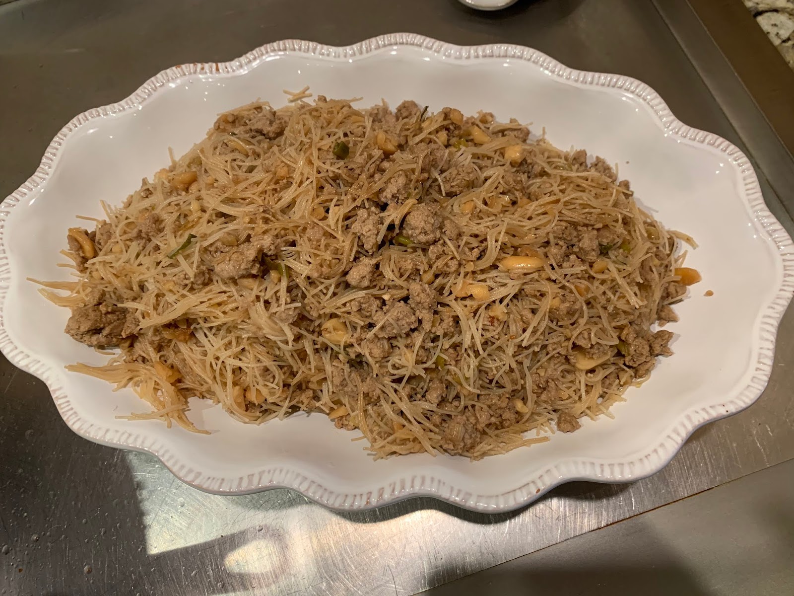 Soak the rice noodles in a large bowl of hot tap water while the meat is marinating.