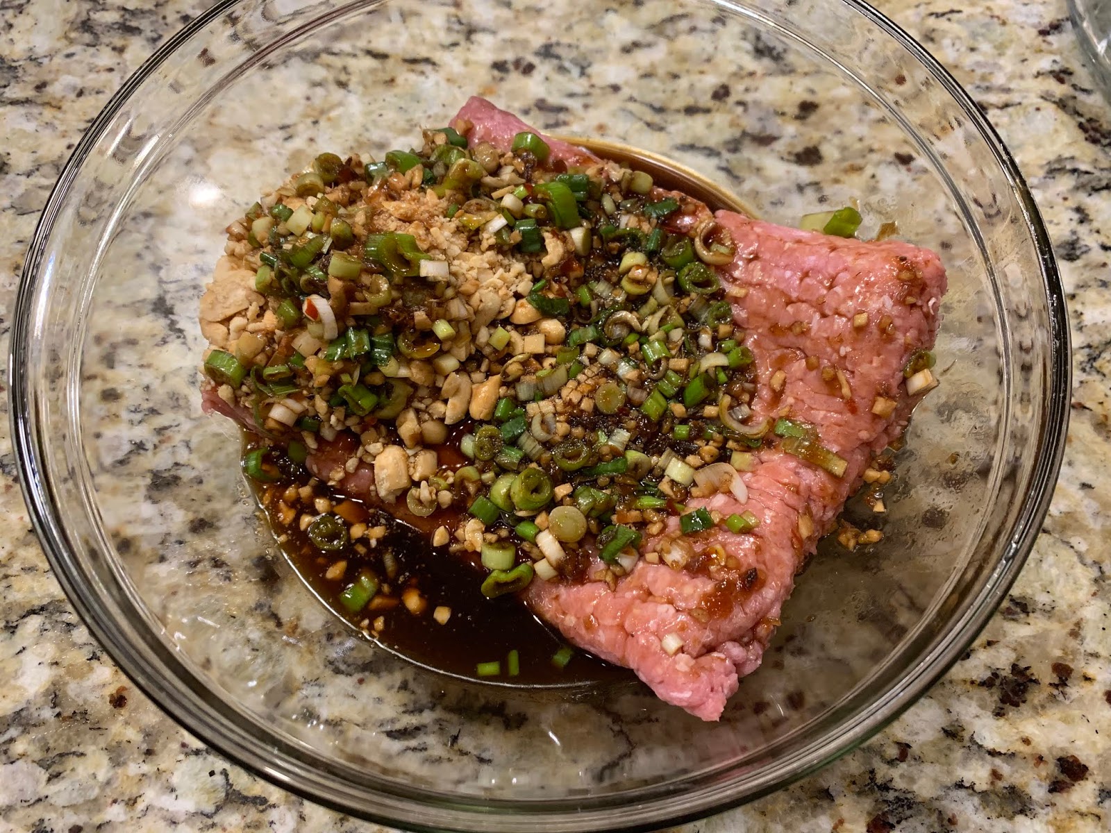 Pour about 3/4 of the sauce into a bowl with the ground chicken (or turkey) and peanuts. Stir to combine – marinate for 15 minutes.