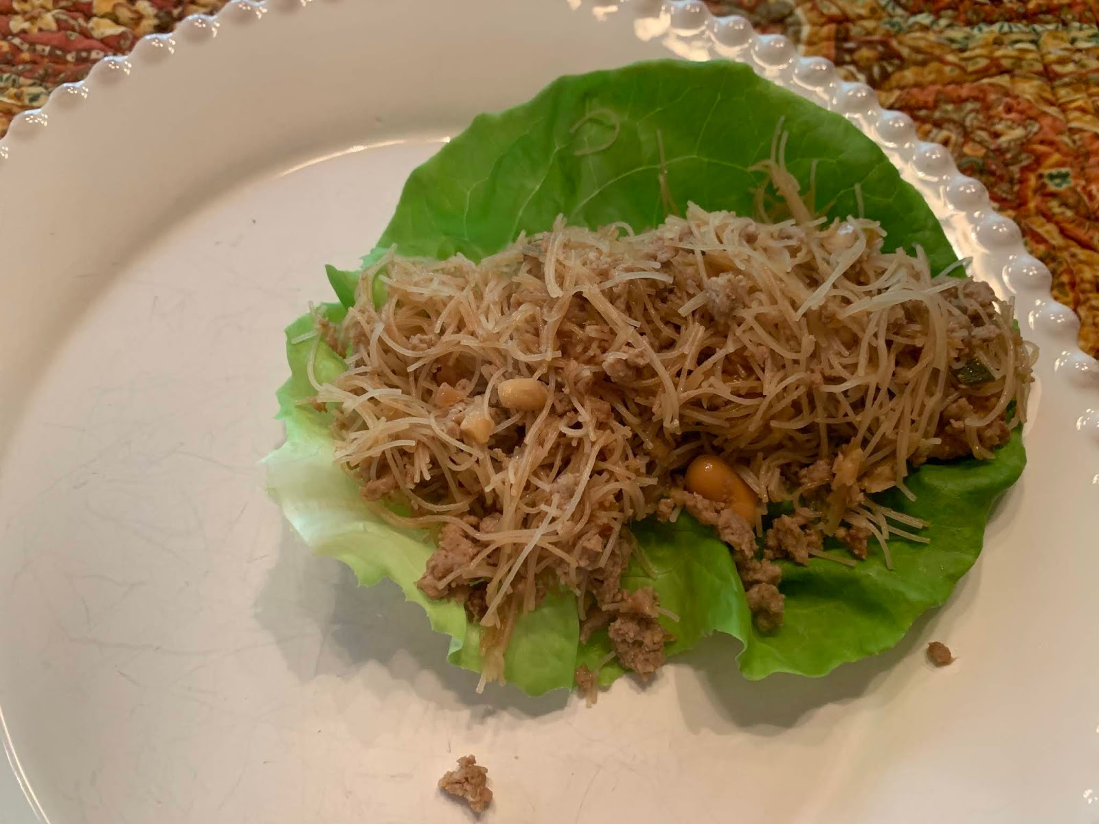 I think my favorite flavor combination in the world is soy sauce, garlic and ginger. These lettuce wraps combine all those flavors with a bit of sweetness from honey. The use of cold crisp lettuce versus a floury wrap saves calories and adds a dimension of taste. And using ground turkey (or chicken), it makes it easier to pile on the mix onto a piece of lettuce. Add the rice noodles and it moves up to another level of deliciousness! But you can leave them off if you want to save more carbs.