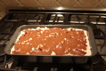 Preheat oven to 350 degrees F. Mix butter and sugar. Add eggs and mix well. Sift dry ingredients, and add to the butter mixture, then add vanilla (and nuts if desired). Pour batter into a greased and floured 9×13 baking pan. Bake about 25-30 minutes (until a wooden pick comes out clean) and then pour mini marshmallows on top. Return to the oven and bake an additional 5-10 minutes – just until lightly browned. Remove from oven and frost.