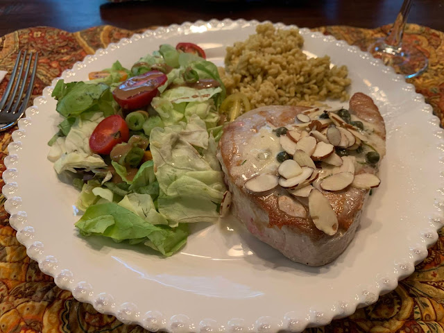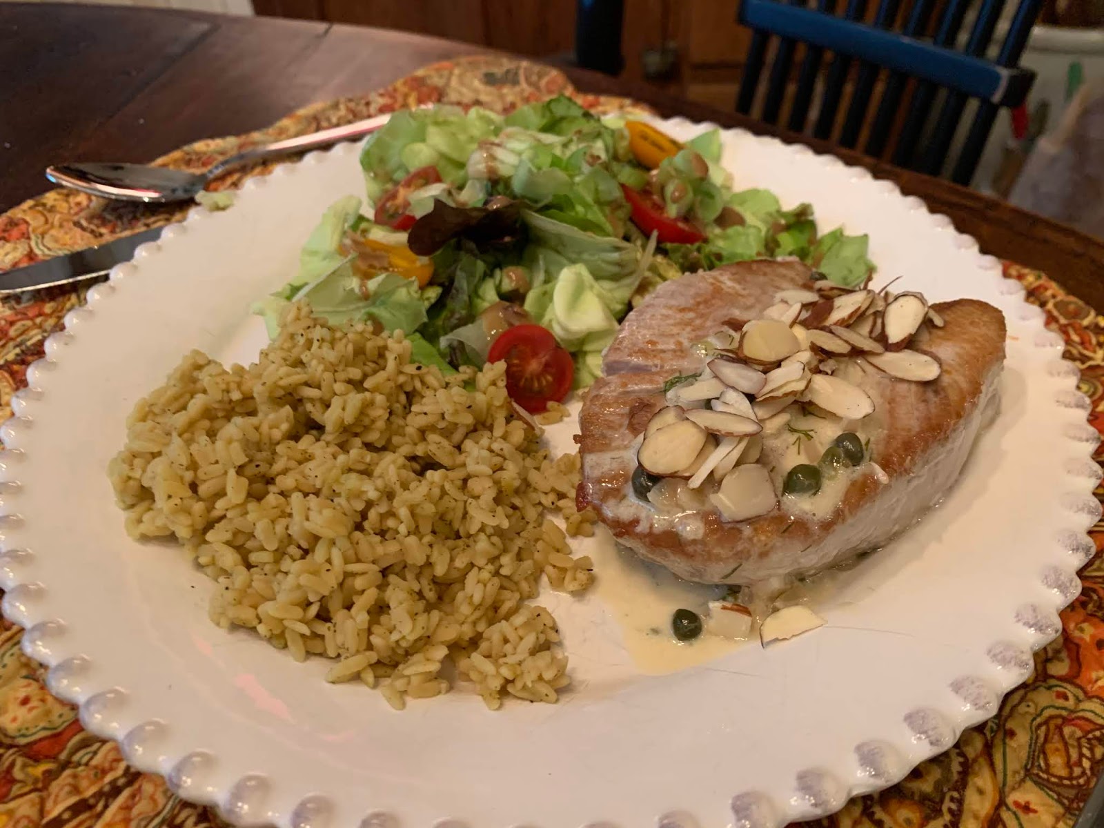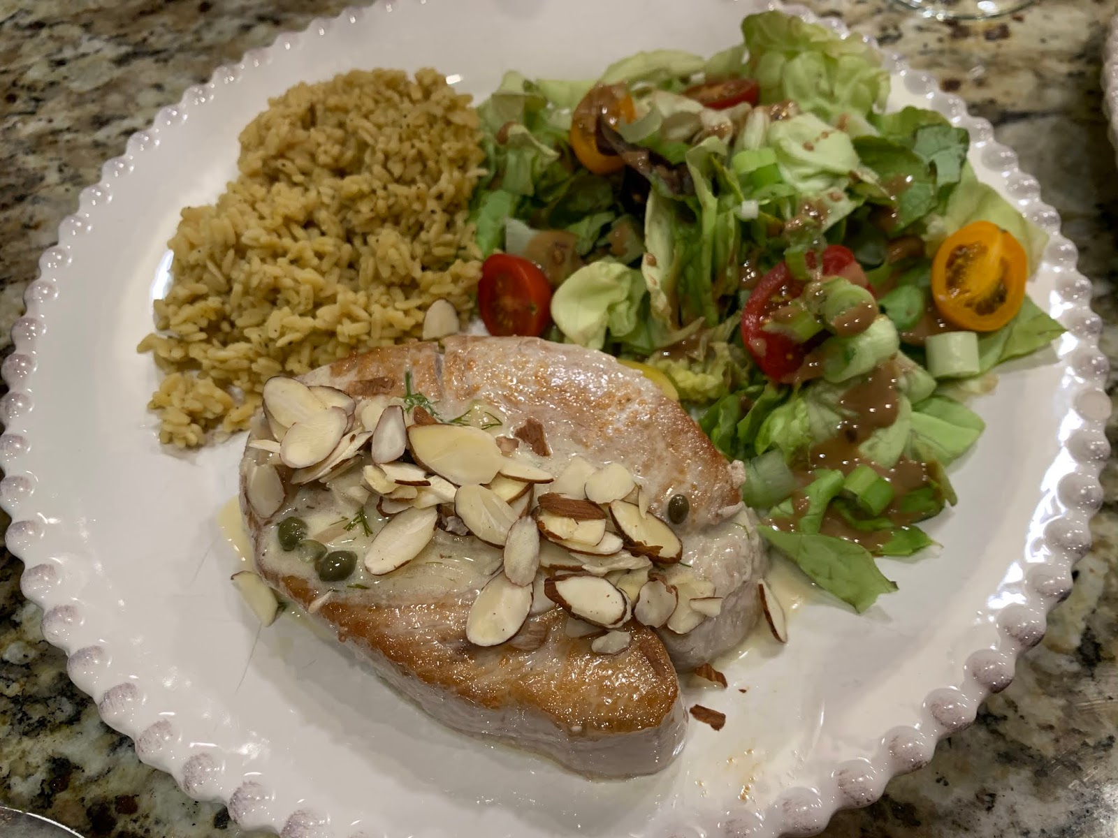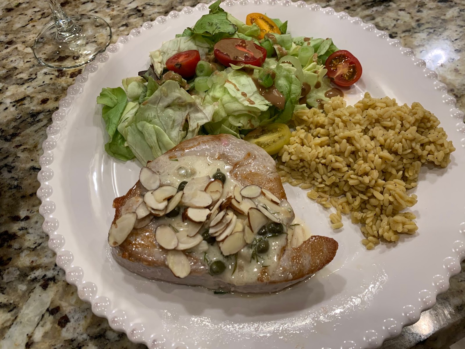 Once cooked, drizzle tuna with sauce and garnish with almonds. I served with a simple salad and cauliflower rice along with my favorite wine!