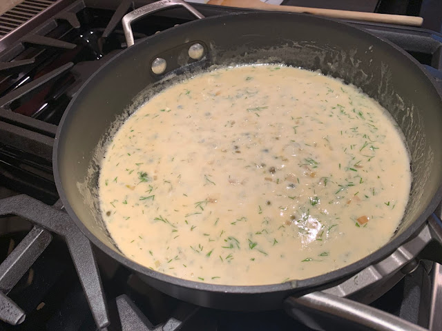 Add dill, lemon juice and capers. Keep warm over lowest heat.